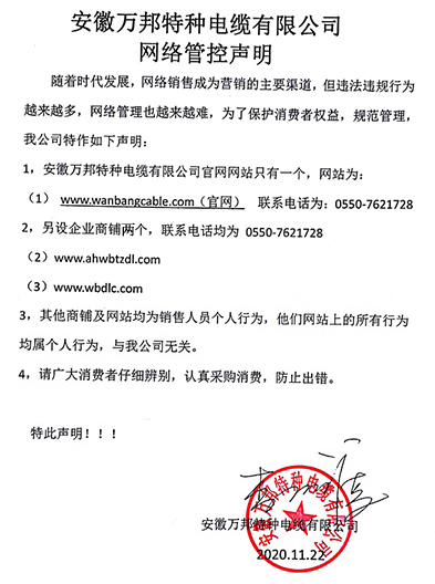 鄭重聲明:安徽萬邦特種電纜有限公司官方網站為:www_wanbangcable_com.haihui88.cn,除此之外無任何子網站或合作網站,其余均為假冒偽劣。電話:0550-7621728 13485756353 地 址:安徽省天長市滁州高新技術產業開發區經四路29號